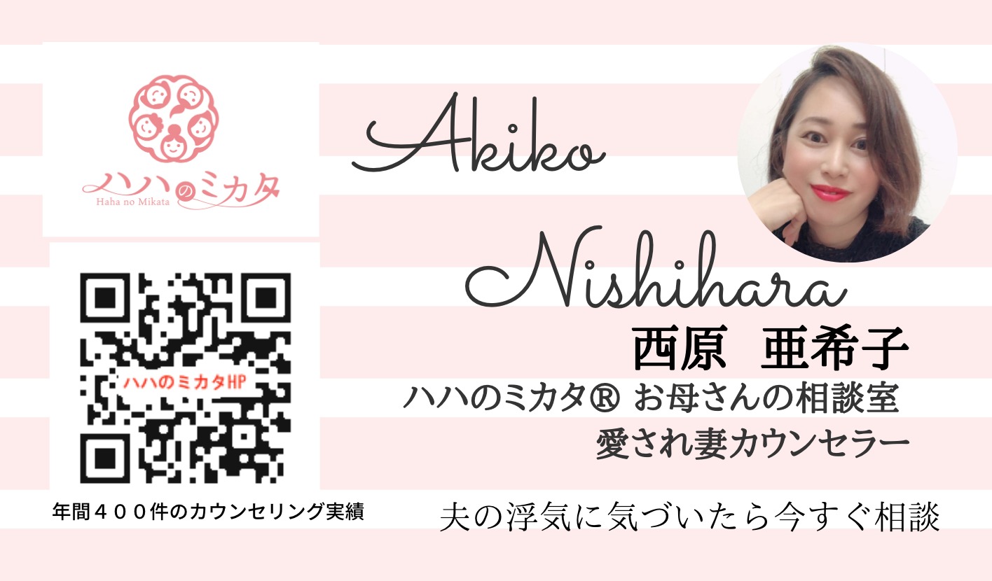 はじめまして あなたを3ヶ月で一生手放せない 愛され妻にする専門家 ハハのミカタ®️相談室 愛され妻カウンセラーの にしはらあきこです。 兵庫県芦屋市、西宮市を中心に 東京・大阪・広島・名古屋 沖縄・新潟・九州・北海道 など 全国に愛され妻塾卒業生を輩出。 愛され妻塾主宰させていただいております。 カウンセリングは 日本各地、世界各国からの依頼多数。 アメリカ、イギリス、シンガポール、タイ、 中国、ドイツ、台湾、オーストラリア、香港。 年間400件以上の夫婦問題解決のご相談を受け、 あらゆる状況の夫婦仲を修復再構築して、 夫の浮気、帰宅拒否、離婚危の回避、 別居解消など問題解決。 再び穏やかな生活を手に入れるための 夫婦のコミュニケーションスキルを伝授。 夫婦再構築の専門家の特技として、 夫婦のすれ違っているポイントを瞬時に見抜き コミュニケーションを改善、 習慣づけを最後までサポートいたします。 卒業生との関係も良好で、 夫婦問題を解決したのちのお茶会やランチ会も好評。 愛され人生を丸ごとサポートしております。 オンラインサロンも充実の内容で、 愛され妻マインドの学び直しができると大好評です。 素敵なオトナ図鑑に掲載されました! 自己紹介動画はこちらから https://youtu.be/Dez0Sa1yAy8